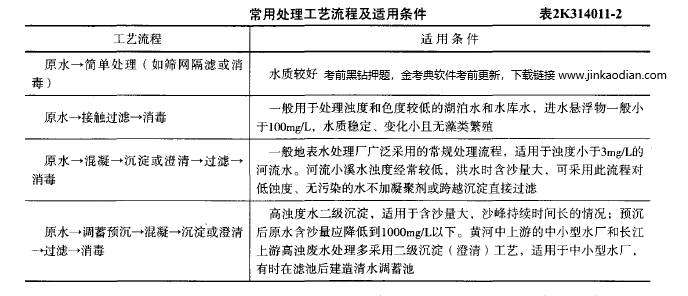 表2K314011-2中内容一般地表水处理厂广泛采用的工艺流程为:原水→混凝沉淀或澄清→过滤→消毒。