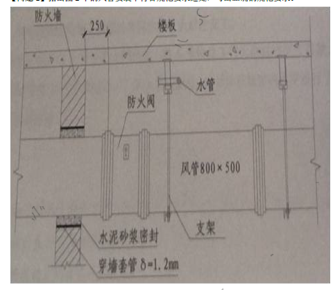 (1)穿墙套管厚度错误,当风管穿过需要封闭的防火防爆楼板或墙体时,应设钢板厚度不小于 1.6mm 的预埋管或防护套管。