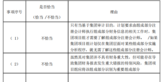 ( 3)集团项目组认为对 重要组成部分 财务信息执行的工作、对集团层面控制和合并过程执行的工作以及在集团层面实施的分析程序还不能获取形成集团审计意见所依据的充分、适当的审计证据,集团项目组决定对甲集团公司的财务报表出具非无保留意见的审计报告。