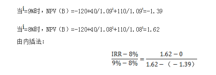 NPV(B)=-120+40×(P/F,10%,2)+110×(P/F,10%,3)=-120+40×0.8264+110×0.7513=-4.3(百万元)
