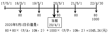 要求:(1)如果该债券每年5月1日支付一次利息,假设年折现率为10%。计算2020年4月1日的债券价值。