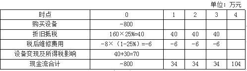 4时点:设备账面价值=800-160×4=160(万元),处置设备现金流入40万元,形成损失160-40=120(万元),可以抵税120×25%=30(万元)。