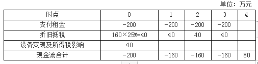 租赁方案的项目净现值=-200-160×(P/A,8%,3)+80×(P/F,8%,4)=-553.54(万元)