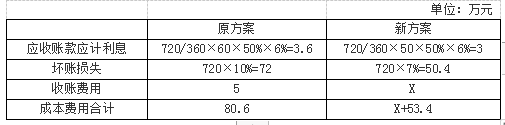 某公司的年赊销收入为720万元,平均收账期为60天,坏账损失为赊销额的10%,年收账费用为5万元。该公司认为通过增加收账人员等措施,可以使平均收账期降为50天,坏账损失降为赊销额的7%。假设公司的资本成本率为6%,变动成本率为50%。