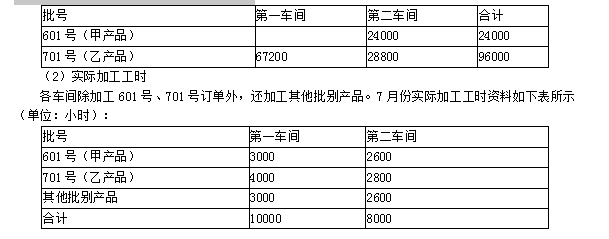 (1)批号601生产甲产品;6月底第一车间在产品10台(6月份投产);7月20日全部完工入库;月末两车间均无601号甲产品在产品。
