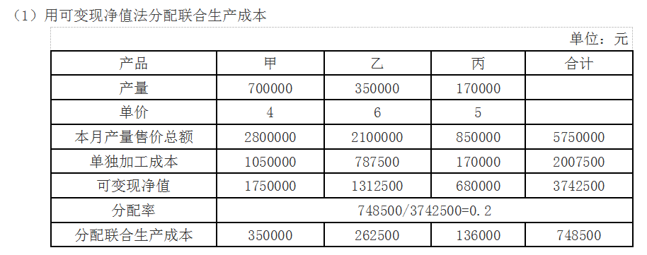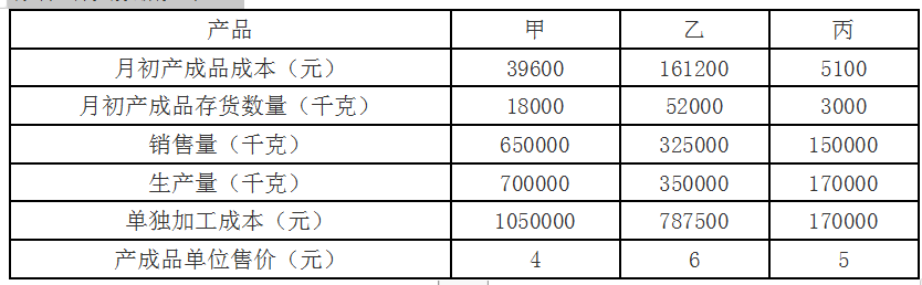 A公司是一个化工生产企业,生产甲、乙、丙三种产品。这三种产品是联产品,本月发生联合生产成本748500元。该公司采用可变现净值法分配联合生产成本。由于在产品主要是生产装置和管线中的液态原料,数量稳定并且数量不大,在成本计算时不计算月末在产品成本。产成品存货采用先进先出法计价。