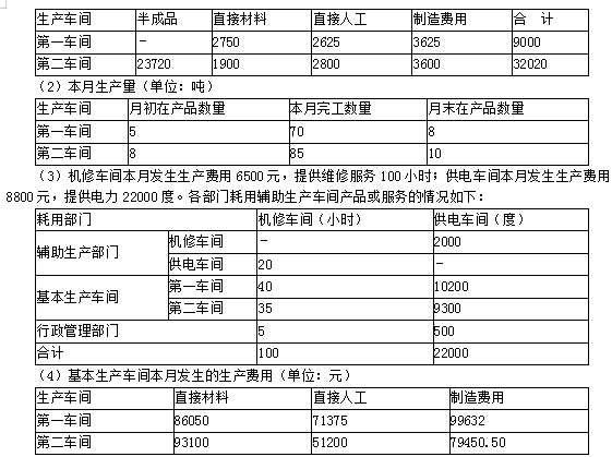 第一车间耗用的原材料在生产过程中逐渐投入,其他成本费用陆续发生。第二车间除耗用第一车间生产的半成品外,还需耗用其他材料,耗用的半成品和其他材料均在生产开始时一次投入,其他成本费用陆续发生。第一车间和第二车间的在产品完工程度均为50%。