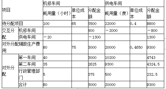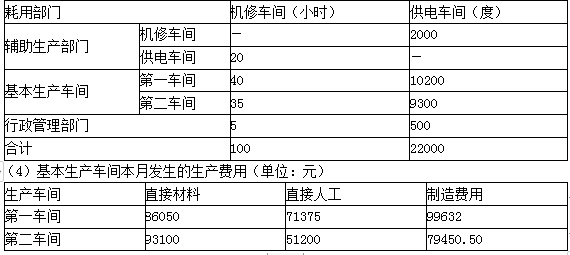 (3)机修车间本月发生生产费用6500元,提供维修服务100小时;供电车间本月发生生产费用8800元,提供电力22000度。各部门耗用辅助生产车间产品或服务的情况如下: