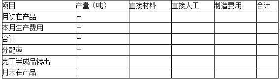 由于第二车间耗用的半成品和其他材料均在生产开始时一次投入,其他成本费用陆续发生。所以,计算半成品和直接材料的分配率时,月末在产品的约当产量=10×100%=10(件),半成品的分配率=285000/(85+10)=3000(元/吨),直接材料的分配率=95000/(85+10)=1000(元/吨)。计算直接人工、制造费用的分配率时,月末在产品的约当产量=10×50%=5(件),直接人工的分配率=54000/(85+5)=600(元/吨),制造费用的分配率=90000/(85+5)=1000(元/吨)。