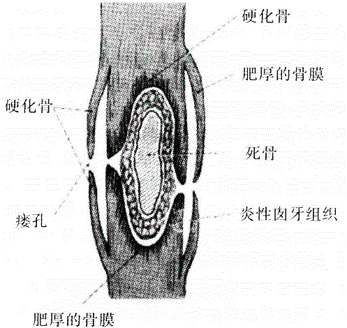 化脓性关节炎起病急骤,有寒战高热等症状,体温可达39℃以上,甚至出现谵妄、昏迷、小儿惊厥。关节疼痛、不敢活动,因剧痛往往拒作检查。如为急性血源性骨髓炎早期患部剧痛,肢体半屈曲状,周围肌痉挛,因疼痛拒作主、被动运动。局部皮温增高,局限性压痛,而肿胀并不明显。数天后骨膜下脓肿形成局部可出现水肿,压痛更为明显。脓肿穿破后成为软组织深部脓肿,疼痛反可减轻,红、肿、热、压痛都更为明显。如果病灶邻近关节,可有反应性关节积液。脓液沿着髓腔播散,则疼痛与肿胀范围更为严重,整个骨干都存在着骨破坏后,有发生病理性骨折的可能。如为化脓性关节炎,关节腔内积液在膝部最为明显,可见髌上囊明显隆起,浮髌试验可为阳性,张力高时使髌上囊甚为坚实。本例由全身感染的中毒症状,右膝部疼痛剧烈,而局部无明显肿胀,应诊断为早期急性血源性骨髓炎。图示如下: