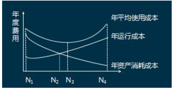 年平均使用成本=平均年度资产消耗成本+平均年度运行成本。设备的经济寿命是年平均使用成本最小时对应的年限,因此是N3。