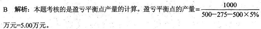 某项目年设计生产能力8万台,年固定成本为1000万元,预计产品单台售价为500元,单台产品可变成本为275元,单台产品销售税金及附加为销售单价的5%,则项目盈亏平衡点产量为( )万台。