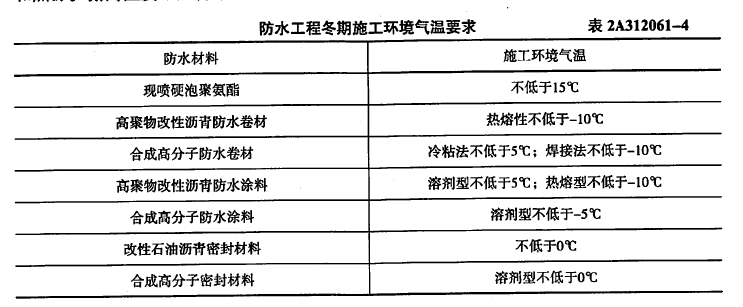 现喷硬泡聚氨酯施工环境气温不低于15℃;合成高分子防水卷材施工环境气温冷粘法不低于5℃;改性石油沥青密封材料施工环境气温不低于0℃。本题施工环境-8℃。